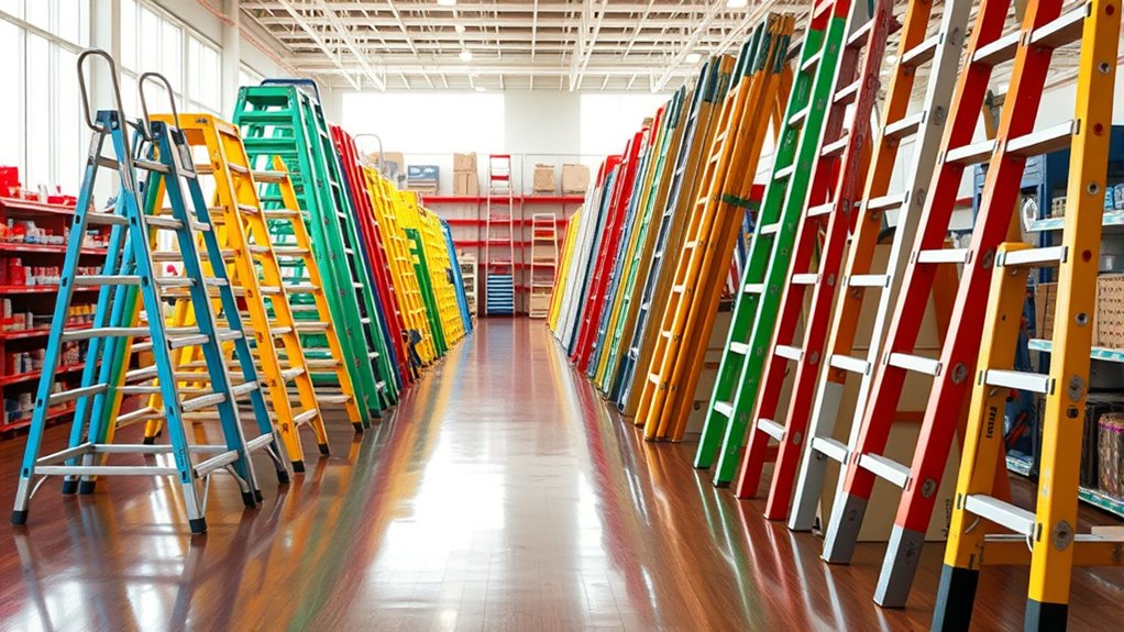 Using a household ladder for professional tasks is like trying to run a marathon in sneakers—it might work temporarily but isn’t ideal. Household ladders often lack the durability and safety features needed for professional use. Consider ladder material, like aluminum for lightweight ease or fiberglass for electrical safety. For serious jobs, investing in a professional-grade ladder guarantees safety, stability, and compliance, preventing accidents and saving you money in the long run.