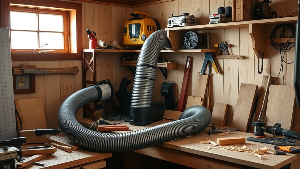 To maintain ideal airflow, you should focus on airflow optimization by regularly inspecting and cleaning your dust collection system. Guarantee your duct design minimizes bends and obstructions, which can reduce airflow. Use appropriately sized ducts for your equipment, and keep filters clean to prevent airflow restrictions. By maintaining a clear, efficient duct system and monitoring airflow, you’ll keep your workshop safe and productive, reducing dust buildup and improving overall safety.