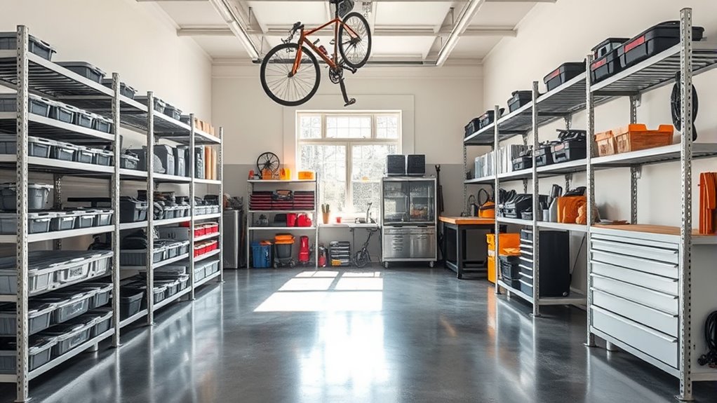 Organizing your garage with shelving systems can transform clutter into a functional space. Choose sturdy metal shelves for heavy tools, and use plastic or wooden shelves for lighter items. Install adjustable or wall-mounted units to maximize vertical space and keep frequently used items within reach. Label bins and categorize your belongings for easy access. With the right setup, you’ll create a clean, efficient garage — and you’ll find tips to optimize your storage as you continue exploring.