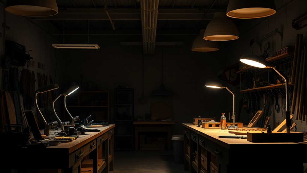They say, “A stitch in time saves nine,” and that applies to your workshop lighting too. You should check your light bulbs regularly and follow a maintenance schedule based on their lifespan, usually every 6-12 months. Replace any flickering or dim bulbs promptly to maintain ideal visibility. Proper upkeep ensures your workspace stays bright and safe, preventing costly disruptions and extending the life of your lighting system.