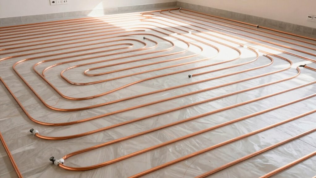 Have you considered how pipe spacing impacts the efficiency and comfort of your radiant floor heating system? Proper spacing ensures even heat distribution and prevents cold or hot spots. When planning your layout, think about maintaining consistent distances between pipes, typically 6 to 12 inches apart, depending on room size and insulation levels. Using pipe insulation around the pipes minimizes heat loss, helping to keep floors warm. Also, avoid sharp pipe bends that can restrict flow and cause uneven heating. By carefully spacing your pipes, you maximize heat delivery, reducing energy waste and increasing comfort. Keep these factors in mind: