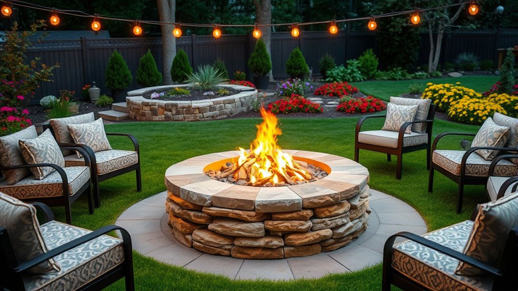 To build a safe, attractive fire pit in your backyard, choose a location away from structures, trees, and overhanging branches, ensuring the ground is level and non-flammable. Maintain a clear radius of about 3-4 feet around the pit, and use durable materials like stone or brick for construction. Keep safety tools nearby, like a fire extinguisher or hose, and never leave flames unattended. For detailed steps and tips, continue exploring the process.