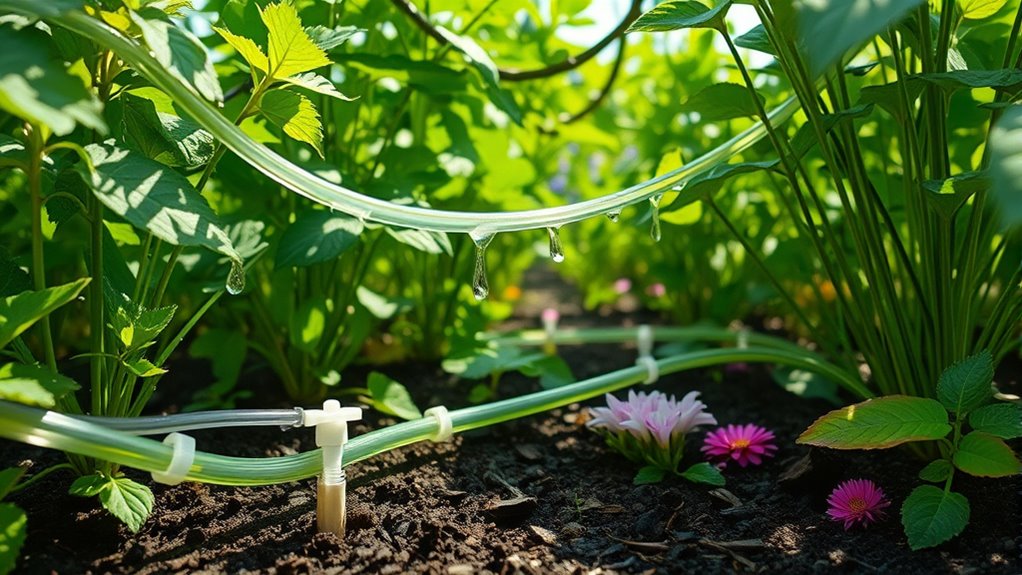 To create a DIY drip irrigation system, start by gathering supplies like tubing, emitters, connectors, and a water source such as a garden hose. Attach a filter, connect the tubing and emitters near your plants, and customize zones as needed. For more efficiency, consider adding soil moisture sensors that automate watering based on real-time data, saving water and enhancing plant health. Keep exploring to discover how to optimize your system further.