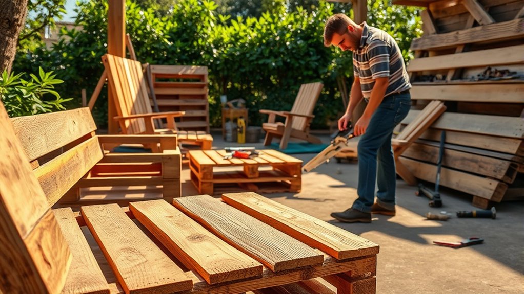 You’ll need essential tools like a saw for cutting pallets, a drill for furniture assembly, and a screwdriver. A sander helps smooth surfaces, while clamps keep pieces in place during assembly. Don’t forget brushes or rags for pallet staining to safeguard your furniture from weather damage. These tools make the process easier and ensure your pallet furniture is sturdy, weatherproofed, and ready for outdoor enjoyment.