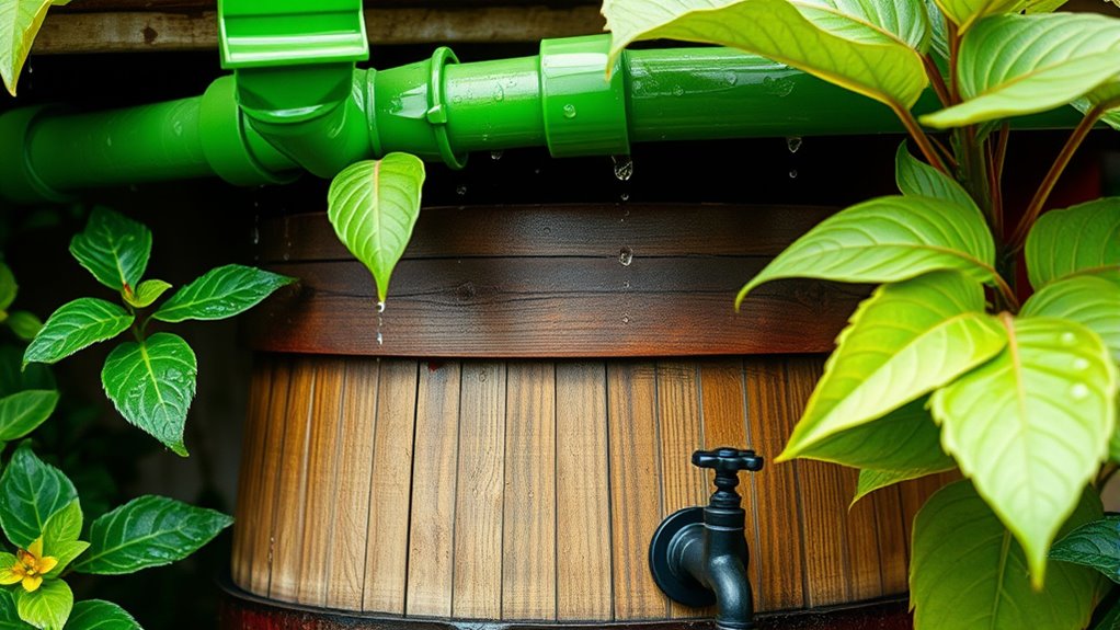 To build your own rainwater harvesting barrel system, find a stable spot beneath a downspout connected to your roof gutters. Use a durable, food-grade barrel with a spigot and add a mesh cover to keep debris out. Connect the downspout with a diverter or hose and make certain the barrel is properly sealed. Regular maintenance and proper placement help maximize water collection and prevent issues. Keep exploring for more tips to create an efficient, eco-friendly system.