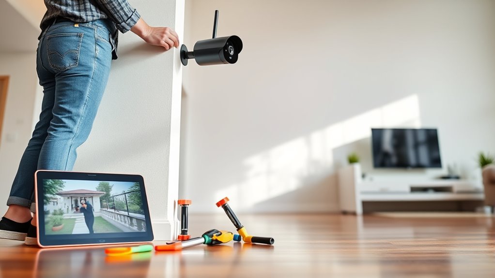 To install a smart home security system yourself, start by ensuring your Wi-Fi network is stable and strong, positioning your router centrally and away from interference. Follow the manufacturer’s instructions carefully during setup, paying attention to connection steps. Keep devices within range of the Wi-Fi to prevent disconnections, and regularly update firmware and apps for better stability. If issues arise, simple troubleshooting tips can help—continue exploring to learn detailed steps for a smooth installation.