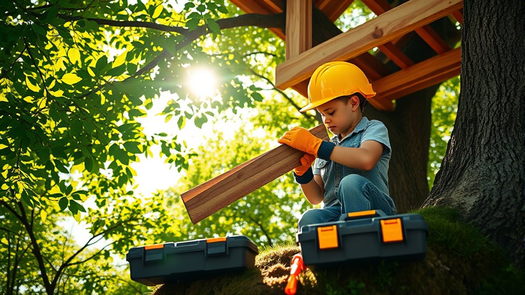 To build a treehouse safely, start by choosing a healthy, sturdy tree free of disease or damage. Secure the structure with proper supports like braces or posts to evenly distribute weight and prevent shifting. Handle tools carefully with protective gear, and work slowly at heights, using harnesses or safety lines. Regularly evaluate your progress for stability, and avoid shortcuts or unsafe fixes. If you keep these tips in mind, you’ll be well on your way to a safe, durable treehouse.