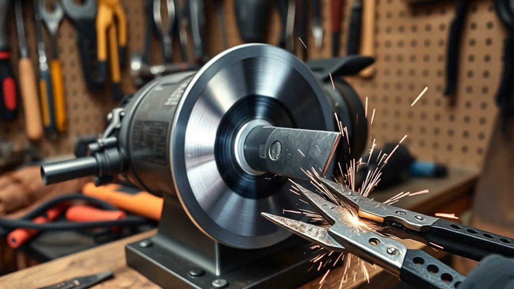 You should set your bench grinder to a moderate speed, usually around 3,000 RPM, for sharpening tools. Use the right grinding wheel selection based on the material you’re working with, and maintain the correct sharpening angle to guarantee a clean edge. Faster speeds can overheat the tool, so keep the tool cool and steady, adjusting your speed as needed for different tools to achieve ideal results.