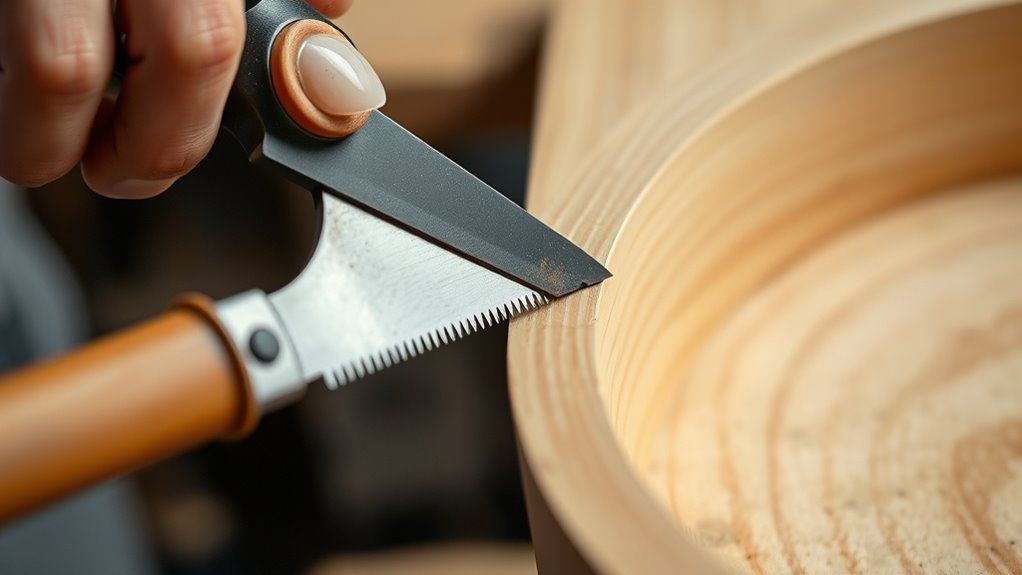 To make curved cuts with a coping saw, pick a blade suited for fine work and guarantee it’s properly tensioned—tight enough to stay straight but not so tight that it breaks. Mark your line clearly and follow it steadily, letting the blade do the work without forcing it. Keep your movements smooth, control your pressure, and practice patience. For detailed tips on sharpening your skills, there’s plenty more to discover.