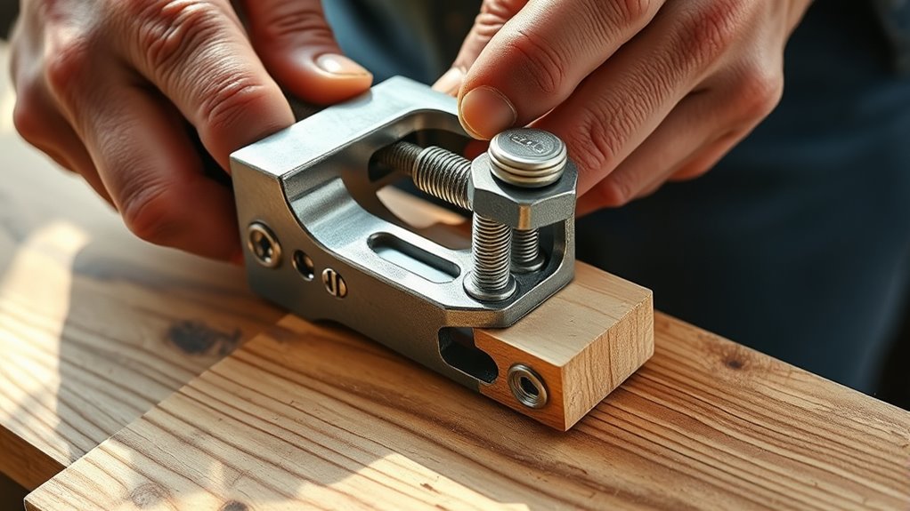 Have you ever struggled with securing materials firmly enough to complete your project? If so, mastering the proper use of hand clamps can make a significant difference. The key to effective clamping lies in proper clamp positioning and understanding safety precautions. When you position your clamp correctly, you ensure a secure hold without damaging your workpiece. Start by selecting the right size and type of clamp for your task. Once you have the right tool, focus on clamp positioning. Place the clamp so that its jaws grip the workpiece evenly, avoiding any tilting or uneven pressure. Position the clamp close to the edge of the material but not so close that it risks splitting or cracking it. Distribute the pressure evenly by placing multiple clamps if necessary, especially on larger or more delicate pieces. This ensures the load is spread out, reducing the chance of deformation or slipping. When tightening the clamp, do so gradually and evenly. This prevents undue stress on the material and guarantees that the workpiece remains aligned. Keep in mind that over-tightening can cause damage or deform the material, so tighten just enough to hold everything securely in place. Always double-check the positioning after tightening to confirm that the clamp isn’t slipping or causing distortion. Safety precautions are equally important when using hand clamps. Wear safety glasses to protect your eyes from accidental slips or debris. Keep your fingers clear of the clamp’s moving parts to avoid pinching injuries. Ensure your work area is clean and free of obstructions, so you have stable footing and control during the clamping process. If you’re working with power tools or cutting equipment nearby, make sure the clamps don’t interfere or cause accidental movement. Use clamps that are in good condition—worn or damaged clamps can fail unexpectedly, posing safety risks. Regularly inspect your clamps for cracks, rust, or bent jaws, replacing any compromised tools immediately. Remember to always release the clamp carefully after your work is complete, easing the pressure gradually to prevent sudden shifts that could cause injury or damage. Being mindful of clamp positioning and adhering to safety precautions not only improves your work quality but also keeps you safe during the entire process. Proper clamp use also involves understanding how to avoid damaging delicate surfaces, which can be achieved by selecting the appropriate clamp pads or protective covers. With practice, you’ll develop a keen eye for the right placement and know when to tighten or loosen your clamps for ideal results. Proper clamp use isn’t just about holding materials in place; it’s about working efficiently and safely, ensuring your project turns out just right.