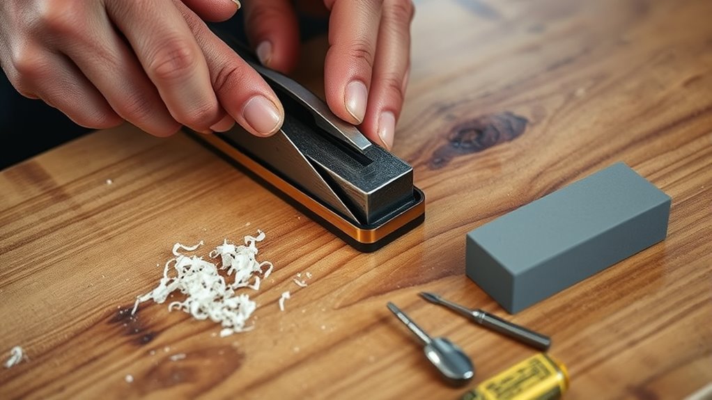 Think of sharpening your spokeshave like handling a delicate sculpture; safety is key. Always wear protective gear such as gloves and eye protection to prevent cuts and debris. Keep your workspace well-lit, organized, and free of distractions. Use a stable surface and proper tools to control the blade’s angle. By prioritizing workspace safety, you safeguard yourself and ensure precise, safe sharpening.