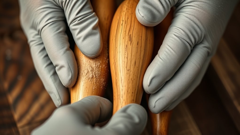 To remove old paint or stain from handles, start with paint removal by applying a gentle solvent like mineral spirits or a commercial paint stripper, then use a plastic scraper to lift the residue. For stain stripping, lightly sand the handle with fine-grit sandpaper, ensuring you don’t damage the wood. Always work in a well-ventilated area and wear gloves to protect your skin during paint removal and stain stripping.