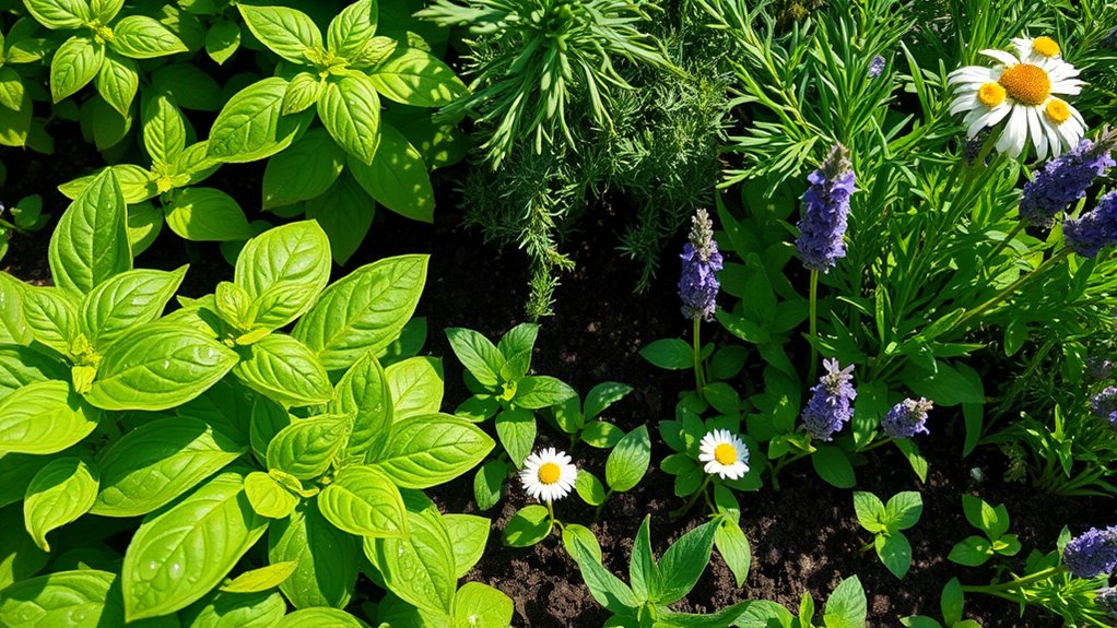 You should start with herbs like basil, mint, and parsley—easy for beginners. These herbs thrive with herb companion planting, which boosts growth and repels pests naturally. Plus, they support organic pest control, reducing the need for chemicals. They’re resilient and low-maintenance, making them perfect for new gardeners. With just a little care, you’ll enjoy fresh herbs while learning the basics of sustainable gardening.