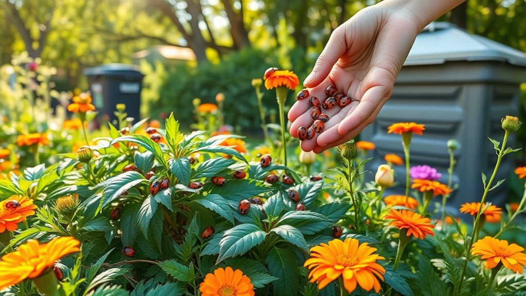 To control pests naturally in your garden, try companion planting by pairing plants that repel pests, like marigolds near tomatoes or basil with peppers. Encourage beneficial insects, such as ladybugs and parasitic wasps, by creating habitat and nectar sources. Combine these methods with practices from integrated pest management, which maintains pest levels at safe rates without chemicals. Keep an eye on your garden’s health to fine-tune your approach—more tips await to help you master eco-friendly pest control.