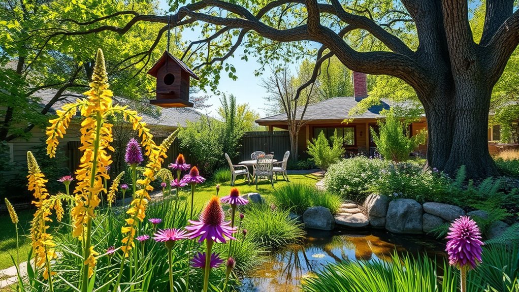 Think of your small yard as a tiny island in a bustling city. Yes, you can create a thriving urban habitat design with small space gardening. Use native plants, add bird feeders, and provide water sources to attract wildlife. Even in tight spaces, careful planning transforms your yard into a lively shelter, supporting local species and bringing nature’s harmony right to your doorstep.
