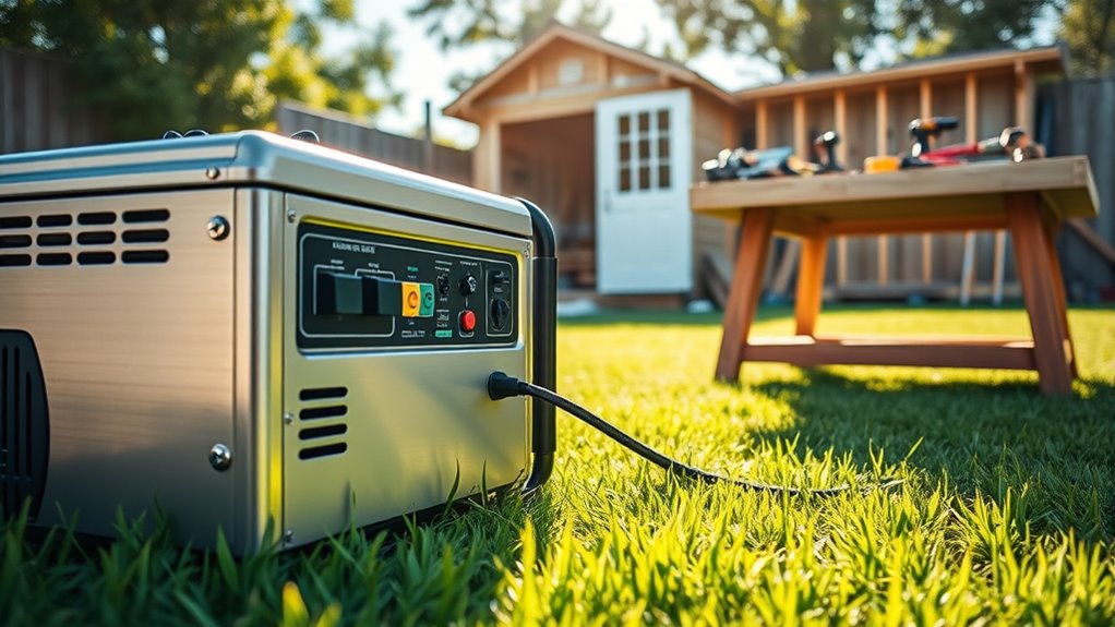 Think of safety features as your generator’s armor—crucial for protection. Look for automatic shutoff systems that activate during overloads, ensuring safety like a guardian angel. Prioritize low noise levels to keep your peace, and check for sturdy fuel efficiency mechanisms to prevent accidents. These features safeguard your home and loved ones, turning your generator into a reliable partner that works quietly and efficiently when you need it most.