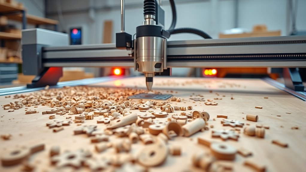 It’s also wise to familiarize yourself with the machine’s controls and emergency stop procedures. Never leave the CNC router unattended while it’s running, and always power it down properly after use. When selecting materials, verify their thickness and composition to guarantee compatibility with your machine’s spindle and bit sizes. Using the wrong material or an incompatible bit can lead to poor cuts, machine damage, or safety hazards. Always read the manufacturer’s guidelines and recommended settings for each material you plan to work with, and start with simple projects to build your confidence.