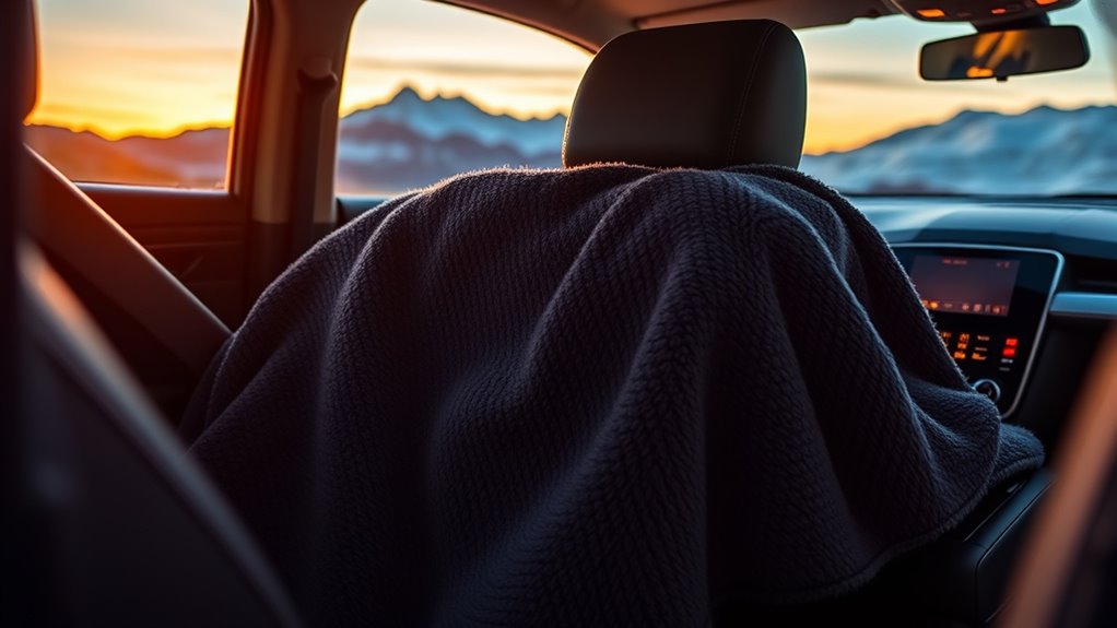 The heating power of a 12V heated blanket directly influences how quickly it warms up and how effectively it keeps you comfortable during your trip. Most models range from 30W to 60W, with higher wattage blankets heating faster but also drawing more current. This means they can warm up in just a few minutes, often within 3-5 minutes, providing quick relief in cold weather. Many blankets offer multiple heating levels or modes, allowing you to adjust the warmth and control how fast it heats. While higher power blankets deliver faster heat-up times, it’s vital to consider their impact on your vehicle’s battery during extended use. Safety features like overheat protection ensure you stay warm without risking overheating, making power and speed essential factors in your choice.