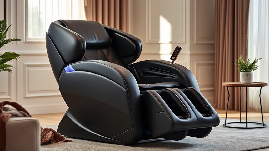 Considering the importance of effective massage technology, I focus on models that feature 4D massage systems, which use multidimensional rollers to deliver deeper, more realistic massages. These rollers adjust in width, depth, and speed, mimicking professional techniques for a personalized experience. Advanced models often include multiple preset auto programs and customizable manual modes, giving you tailored control. The inclusion of SL-Track or long track systems guarantees thorough coverage from neck to thighs, boosting therapeutic benefits. Many chairs also incorporate airbags, heat therapy, and stretching functions to enhance relaxation. Control options like touchscreens, app connectivity, and AI voice commands make it easy to personalize settings, ensuring you get the most out of your massage experience with convenience and precision.