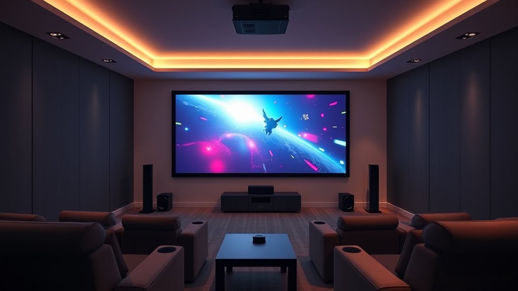 Selecting the right brightness level is essential for guaranteeing your home theater projector delivers vibrant, clear images under your specific lighting conditions. For most indoor setups with controlled lighting, 1500 to 3000 lumens work well, providing enough brightness without washing out colors or details. If your room has significant ambient light or you plan to use the projector outdoors, you’ll want a higher brightness—above 3000 lumens—to maintain image clarity. Darkened rooms can get by with 1000 to 2000 lumens, but higher lumens offer more flexibility for varying lighting conditions. Many modern projectors feature adjustable brightness settings, allowing you to tailor the image quality to your environment easily. Ultimately, matching your projector’s brightness to your room’s lighting assures the best viewing experience.