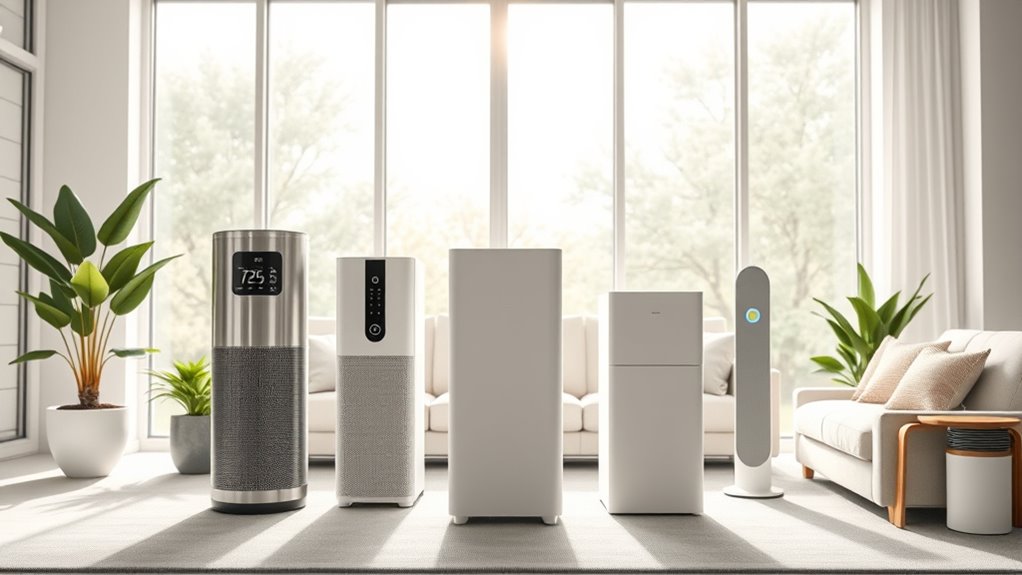 If you’re looking for the best air purifiers to breathe cleaner, fresher air in 2025, I recommend options like LEVOIT’s Core300-P and Essential 200S-P for large rooms, WINIX’s 5510 for auto-mode efficiency, and PuroAir’s two-pack for wider coverage. These models feature advanced HEPA filters, smart controls, and quiet operation, making them ideal for homes and offices. Keep watching to discover detailed insights on each and find the perfect fit for your space.