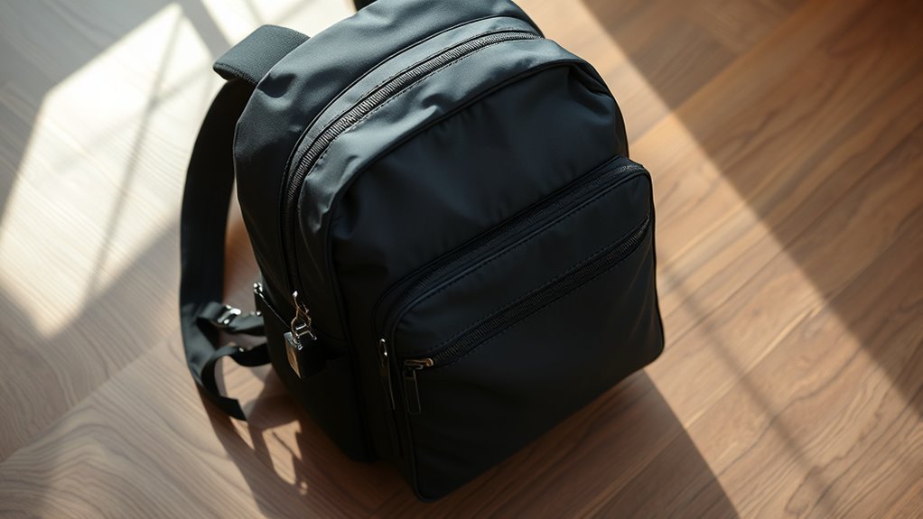 Anti-theft backpacks have hidden zippers, lockable compartments, and RFID-blocking pockets, making it harder for pickpockets to access your belongings. They often feature slash-resistant fabric and secure closures that deter theft. I love how these security features give me peace of mind when traveling, knowing my valuables are protected. Regular backpacks lack these specialized features, making anti-theft options a smarter choice for keeping your gear safe and secure.