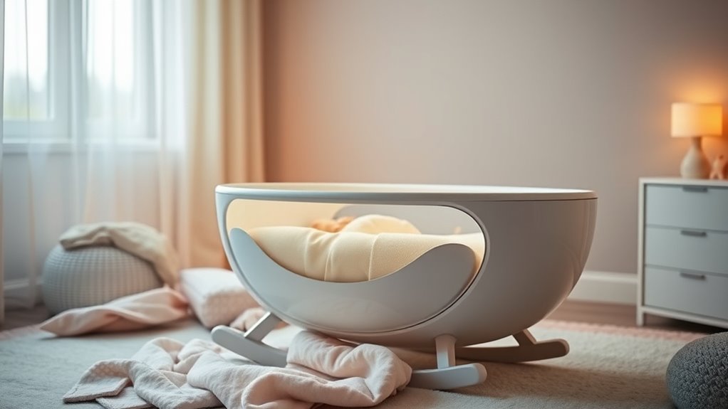 Soothing features and sounds play a vital role in calming your baby and guaranteeing a peaceful sleep environment. Many auto-rocking bassinets come with a variety of calming sounds like lullabies, white noise, and nature sounds, which can help soothe your infant effectively. Several models offer customizable sound settings, so you can choose or create playlists tailored to your baby’s preferences. The integration of cry detection allows the bassinet to respond automatically with appropriate sounds and gentle motions when your baby cries, reducing your intervention. Adjustable volume levels and sound intensity ensure you can match the sound environment to your baby’s sensitivity and room conditions. Combining these features can lead to longer, more restful sleep for your little one, easing your nighttime routine.