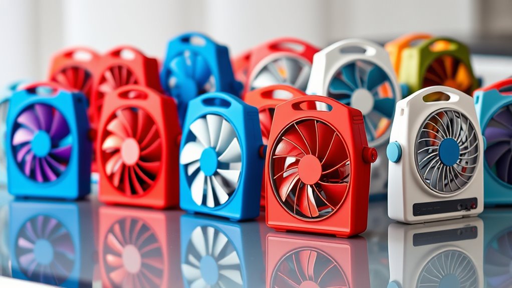 Choosing a mini fan with strong cooling performance depends largely on its power settings and airflow capabilities. Higher wattage fans generally produce stronger airflow, making them more effective during emergencies. Fans with multiple adjustable speed settings let you customize airflow based on your cooling needs, providing flexibility. A high-capacity battery, such as 2000mAh or more, ensures longer operation, so you stay cool longer without frequent recharges. Fans with efficient motors and aerodynamic blades can deliver higher airflow velocity while maintaining energy efficiency, which is essential in urgent situations. The maximum airflow speed, measured in feet or meters per second, directly indicates the fan’s cooling power. Prioritizing these factors helps you choose a mini fan that truly delivers powerful, reliable cooling when it matters most.