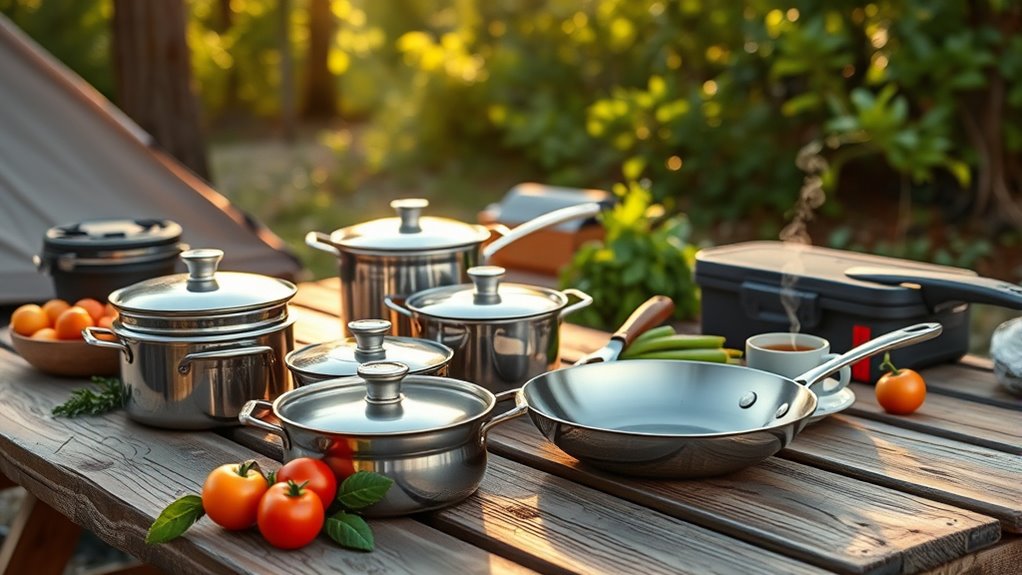 When choosing camping cookware, durability and versatility are key—did you know that 78% of campers prioritize lightweight gear? With the right set, outdoor cooking becomes easy and enjoyable, no matter where you are. Whether you’re a weekend adventurer or a seasoned backpacker, investing in quality cookware makes all the difference. So, pick a set that suits your needs, and get ready to enjoy delicious meals under the stars!