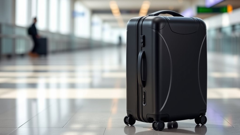 Security features for devices connected to USB ports include built-in surge protection, which prevents voltage spikes from damaging your gadgets. Many luggage options also have password-protected compartments for added safety, and some use encrypted connections to safeguard data. I recommend choosing luggage with these features to guarantee your devices stay protected from electrical surges and unauthorized access while you’re traveling.