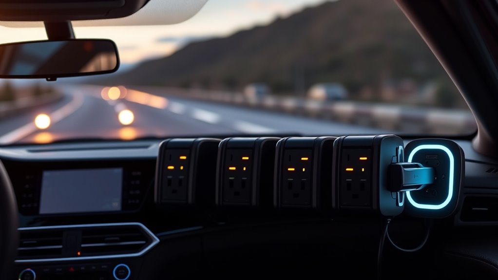 Since size and portability are key when it comes to using a power inverter in my car, I pay close attention to compact designs that are easy to store and carry. A good inverter typically measures less than 6 inches in length and width, making it simple to fit in cup holders or glove compartments. Weighing under 10 ounces, these lightweight models are effortless to transport during trips, camping, or emergencies. Despite their small size, they often include multiple USB ports and dual AC outlets, providing versatile device charging options. Many portable inverters also feature quiet, integrated cooling fans that keep the unit efficient without adding bulk. Overall, choosing a compact inverter guarantees compatibility with various vehicle models and makes on-the-go power more convenient.