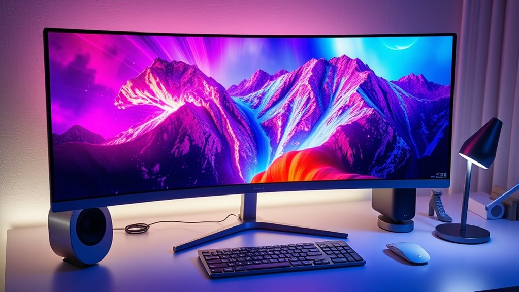 To achieve truly immersive viewing on a curved monitor, paying attention to visual quality features is essential. Higher resolutions like 3440×1440 or 2560×1440 offer sharper, more detailed images that draw you in. HDR support and wide color gamuts, such as 99% sRGB or 97% DCI-P3, boost color accuracy, contrast, and visual depth, making scenes pop with vibrancy. The curved screen’s radius, typically 1500R or 1800R, aligns with the human eye’s natural curvature, reducing distortion and fatigue. High refresh rates—like 165Hz or 240Hz—paired with quick response times (1ms MPRT) ensure smooth motion, even during fast-paced action. Visual enhancements like HDR10 and AI-based optimization further deliver vibrant, lifelike images with impressive clarity.