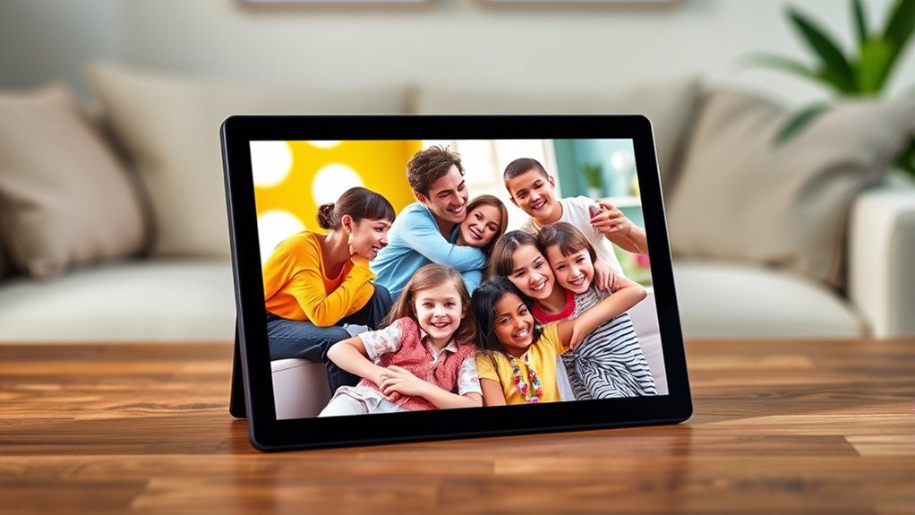 To make the most of a digital photo frame’s email-sharing capabilities, I focus on its customization features. I look for frames that let me tweak slideshow timing, transition effects, and image scaling, so I can create a tailored viewing experience. Supporting personalized captions, date stamps, or weather overlays helps add context to my shared photos. Adjustable brightness, auto-rotation, and options to hide or highlight specific images make it easy to customize presentations to my liking. Flexible layout options, including orientation adjustments and customizable display order, ensure the frame fits my space perfectly. Finally, I prefer frames with intuitive controls via touchscreen or app, so I can quickly make adjustments without hassle, making sure my shared photos look exactly how I want.