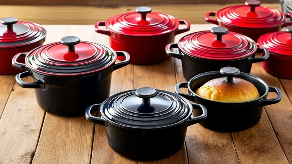 If you’re looking for the best Dutch ovens for baking sourdough, I recommend models between 4.5 and 7 quarts. These options, like the Martha Stewart Gatwick, Lodge 7Qt, and Bruntmor, offer excellent heat retention, even distribution, and durable enameled or cast iron surfaces. They produce perfect crusts and versatile cooking results. Keep exploring to find detailed features and tips to choose the right one for your baking needs.