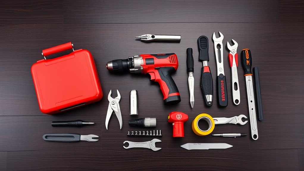 Imagine a compact toolbox slipping easily into a closet or under a sink—that’s how I choose a portable kit for small spaces. I look for lightweight, organized sets with essential tools like a small screwdriver, pliers, and a tape measure. It’s all about maximizing space without sacrificing versatility. I prefer sturdy containers that keep everything tidy and accessible, so I can grab it quickly whenever I need it.