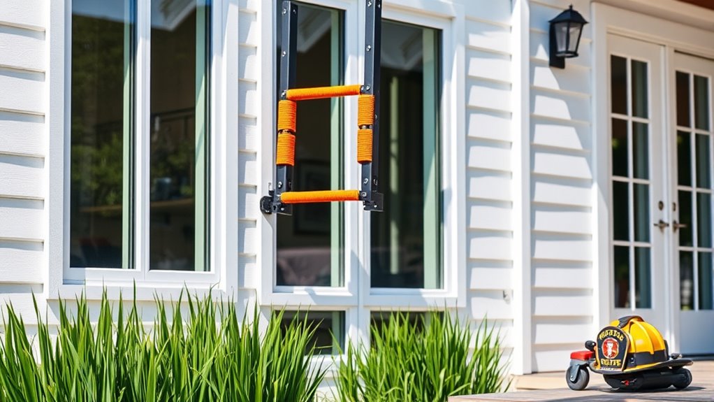 During an emergency, I found that emergency ladders are surprisingly easy to deploy—like unfolding a paper fan. With a little practice, I can set mine up in seconds, ensuring quick escape. They’re designed to be straightforward, with clear instructions and simple mechanisms. Just remember to familiarize yourself beforehand, so when time’s critical, you can rely on them without panic. It’s a small step that could save your life.