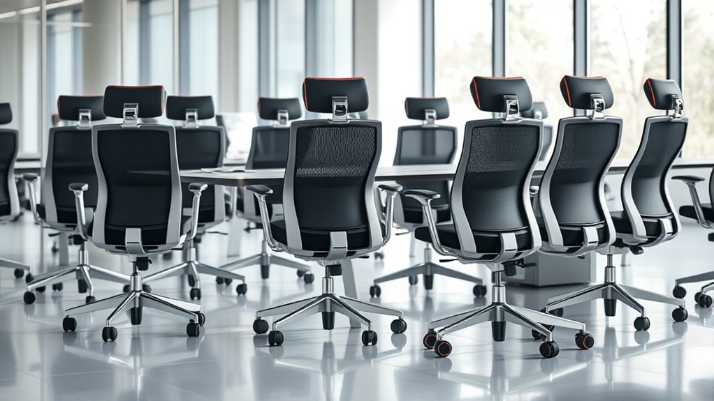 Opting for breathable materials in ergonomic office chairs is essential for staying comfortable during long hours at your desk. High-quality fabrics like mesh promote better airflow, helping to reduce heat buildup and sweating. Mesh backrests with dense, reinforced fibers offer durability without sacrificing breathability or support. Breathable seat cushions made from mesh or ventilated foam help dissipate heat, keeping you cooler throughout the day. Materials that are moisture-wicking and quick-drying prevent discomfort caused by perspiration, especially in warmer environments. Additionally, certified breathable fabrics ensure consistent air circulation and resist deformation over time, maintaining ergonomic support. Choosing chairs with these materials can markedly enhance comfort, helping you stay focused and productive during extended sitting sessions.