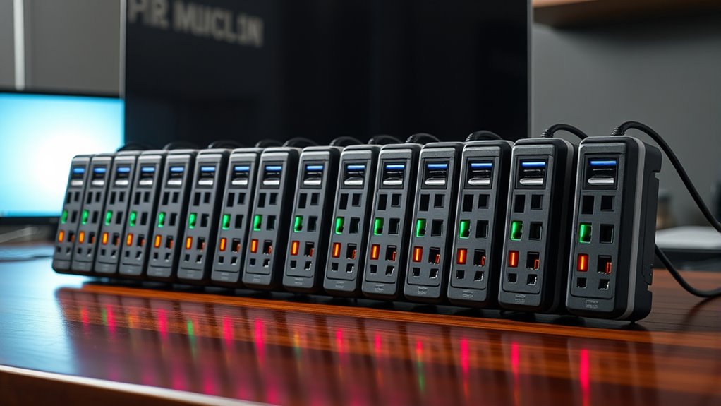 If you’re looking for the best surge protectors of 2025, I recommend models with high Joules ratings, ample outlets, and safety certifications like UL or ETL. Look for features such as USB ports, space between outlets, and sturdy durability, especially if you need something versatile for work, travel, or home. The right choice depends on your device load and setup, so keep exploring to find the perfect fit that keeps your electronics safe and powered up efficiently.