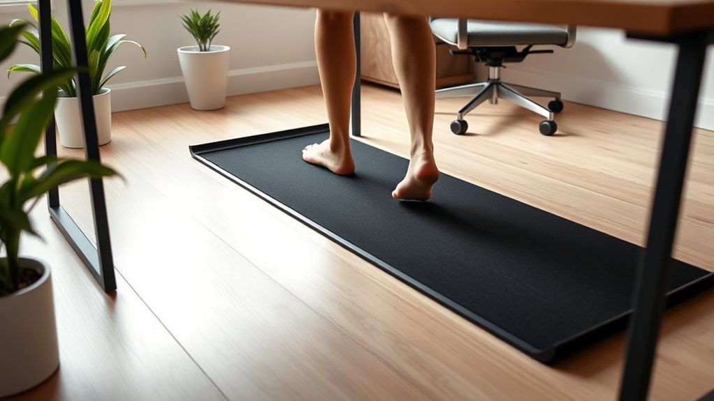 Safety features are vital when selecting a foldable walking pad for under-desk use, as they directly impact your security and confidence during workouts. I always check for emergency stop buttons or safety keys that instantly halt the machine if needed, preventing accidents. Non-slip surfaces and shock absorption systems are essential to avoid slips and reduce joint stress. Securely attached safety handrails or handles provide support and stability, especially for beginners. I also look for clear safety instructions and a weight capacity limit to prevent overloading, which could cause malfunctions. Finally, quiet operation levels below 45 dB ensure I stay aware of my surroundings without distracting noise. These safety features give me peace of mind, letting me focus on my activity safely.