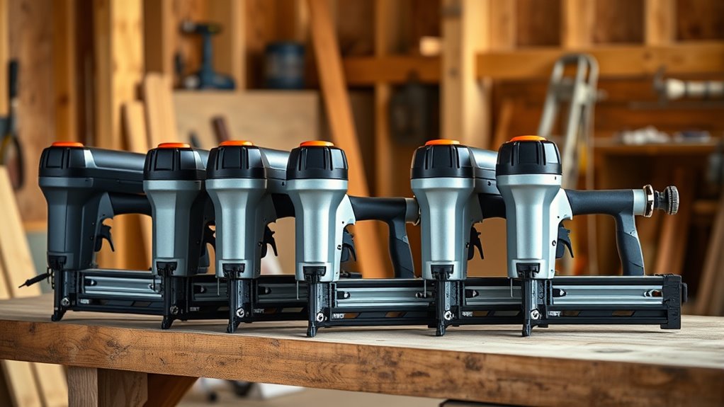 Looking for the best framing nailers for heavy-duty projects in 2025? I’ve tested a variety of models—from cordless options like the Dewalt palm nailer to pneumatic tools such as the Freeman and AEROPRO kits. These nailers are durable, powerful, and versatile, perfect for framing, roofing, and construction tasks. If you want reliable performance and top features, keep going—I’ll guide you through the standout choices and what to contemplate before buying.