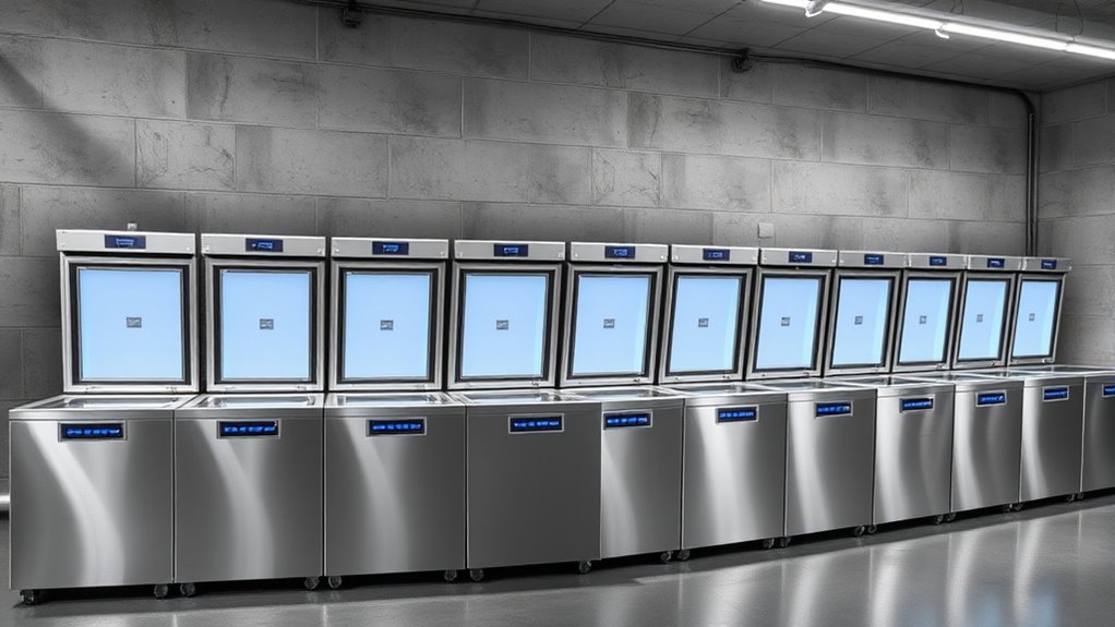 Garage-ready freezers usually come with safety features like temperature alarms that alert me if conditions go out of range. I also look for models with secure locking lids to prevent accidental openings, especially important if kids are around. Some have auto-defrost functions to avoid ice build-up, and sturdy construction to withstand temperature fluctuations. These features give me peace of mind, knowing my stored items stay safe and the freezer stays reliable.