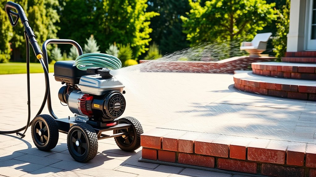 Choosing a gas pressure washer with a durable engine is crucial for long-lasting performance and reliable cleaning power. I look for engines with a 4-stroke OHV design because they offer a longer lifespan and consistent power output. Engine power, measured in horsepower (HP) and cubic centimeters (cc), indicates cleaning capacity—higher values mean more strength and sustained performance. I also prioritize models with forced air cooling systems to prevent overheating during extended use, ensuring steady pressure. Recoil start engines are common, but electric start options add convenience. Proper maintenance, like regular oil changes and using high-octane fuel, is essential to keep the engine durable and performing well over time. A reliable engine ensures your pressure washer can handle tough jobs without faltering.