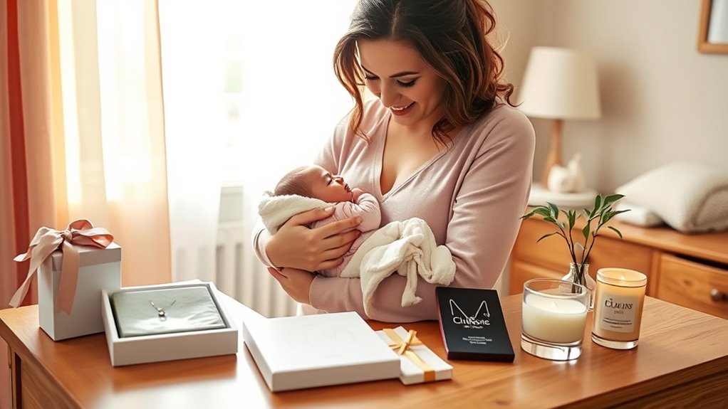 Practicality and usefulness are key factors to contemplate when choosing gifts for new moms in 2025 because they help simplify daily routines and provide ongoing support during the busy postpartum period. I recommend selecting items that serve a clear purpose, like durable mugs or comfortable clothing, which she can use every day. High-quality materials guarantee these gifts last through countless busy days, making them worthwhile investments. Self-care gifts, such as calming candles or skincare, promote relaxation and stress relief, which are essential during this time. Convenience is also crucial—think insulated tumblers or multi-purpose accessories that fit seamlessly into her hectic schedule. Versatile items that can be used at home or on the go maximize usefulness, helping new moms stay organized and comfortable amidst their busy lives.