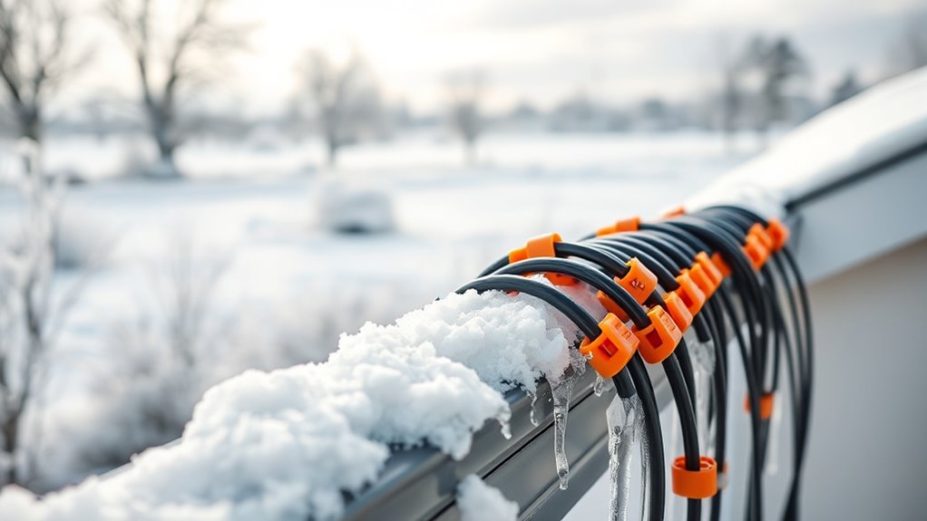Choosing the right gutter de-icing cable involves balancing power output and length to guarantee effective melting without overloading circuits. Cables range from 5 to 8 Watts per foot, with higher wattage providing more heat—ideal for extremely cold conditions or longer gutters. The length of the cable should match your gutter or roof section precisely, preventing gaps in coverage. Longer cables may need higher power ratings or multiple power sources to maintain consistent heat along the entire length. Proper sizing is essential to avoid electrical overloads and guarantee safety. By selecting a cable with the right wattage and length for your specific gutter size, you’ll improve melting efficiency and keep your gutters ice-free all winter without risking electrical or safety issues.