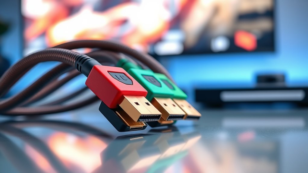 When choosing an HDMI cable, I look at supported resolutions and refresh rates to guarantee I get smooth visuals. I also consider the cable’s length and build quality to match my setup and last over time. Ultimately, I check device compatibility and certification standards to avoid any connection issues.