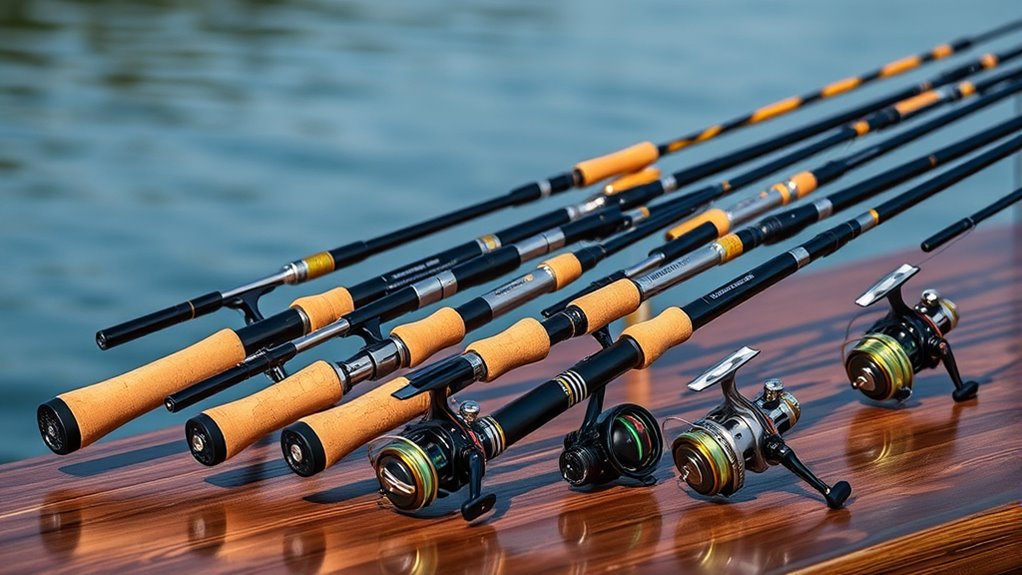 A well-balanced fishing rod combo feels almost effortless to handle, allowing for smooth casting and retrieval without causing fatigue over long hours. The key is weight distribution; a balanced setup reduces strain and enhances precision. Responsiveness is essential, with a sensitive tip that detects subtle bites while maintaining strength for fight control. Material quality, like carbon fiber or composite blends, plays an important role by providing stiffness without adding unnecessary weight. The connection between reel and rod must be secure and smooth, ensuring the combo stays balanced during casts and retrieves. Grip design also matters—ergonomic handles that fit comfortably in your hand improve control and reduce fatigue, especially during long fishing sessions. Overall, a balanced feel elevates your confidence and effectiveness on the water.
