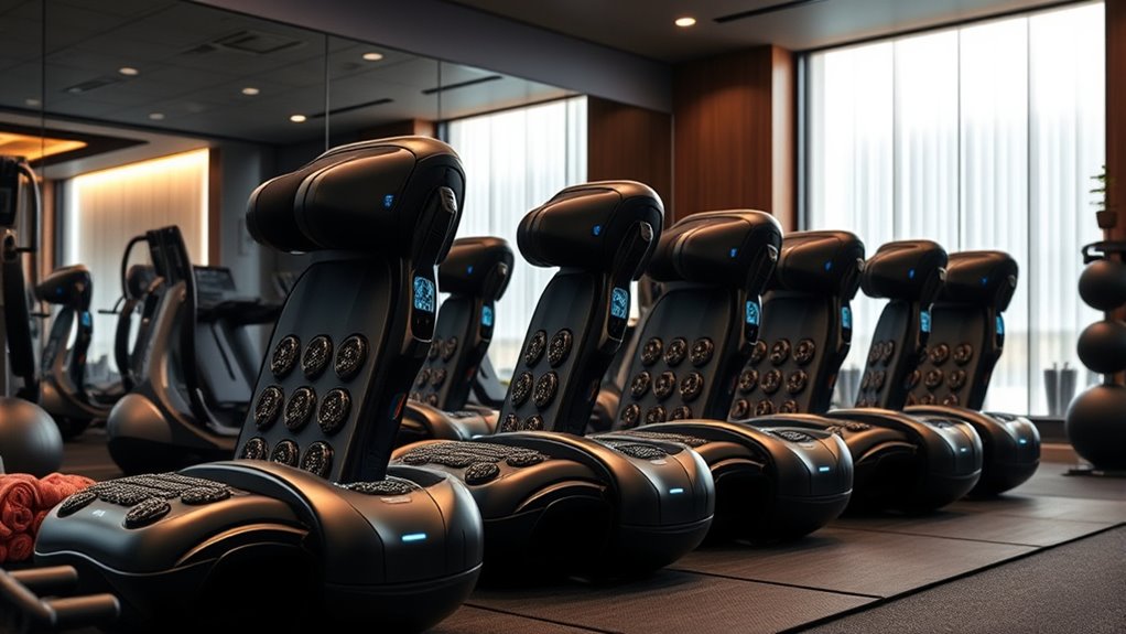 High-end fitness massagers stand out not only for their power and intensity but also for the wide range of interchangeable attachments they offer. These attachments—like flat, bullet, and roller heads—allow me to target different muscle groups precisely. The versatility of massage heads means I can customize treatments for various body parts, including shoulders, back, legs, and neck, ensuring all-encompassing relief. Adjustable pressure and speed settings enhance this adaptability, letting me switch between gentle relaxation and deep tissue work effortlessly. Some premium models even include specialized heads with heat or vibration functions, intensifying the massage experience. The ability to seamlessly change attachments makes these devices incredibly versatile, allowing me to tailor my recovery routine to my specific needs and preferences.