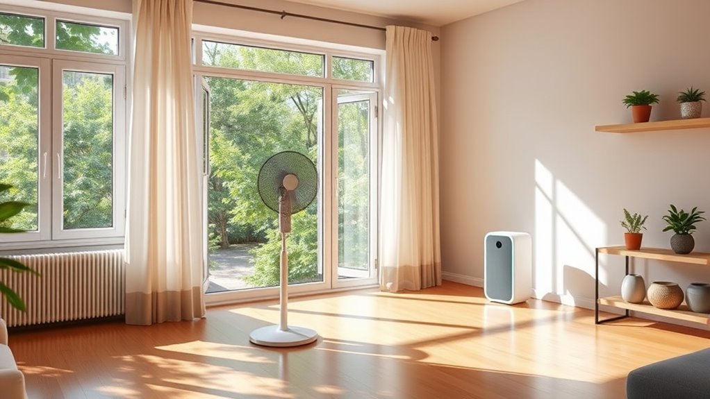 To prevent backdrafts when ventilating rooms without electrical fans, I open windows on opposite sides of the space to create a gentle cross-breeze. I make sure vents or other openings are not blocked, allowing fresh air to flow in naturally. I also avoid opening too many windows at once, which can cause rapid pressure changes. This way, I guarantee proper ventilation without risking dangerous backdrafts.
