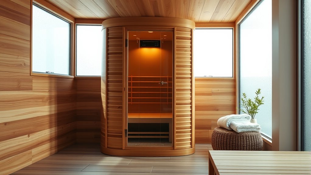 Choosing the right home sauna kit depends heavily on your budget, so it’s important to determine what you can afford upfront. High-end models can cost several thousand dollars, but basic options are often under $1,000. Remember to contemplate the total cost of ownership, including installation, maintenance, and potential upgrades, to avoid surprises down the line. Comparing features like heating technology, capacity, and amenities at different price points helps you find the best value. Keep in mind that cheaper sauna kits may lack safety features or use lower-quality materials, which could increase long-term costs. Also, factor in professional installation costs, especially if electrical work or specialized assembly is needed. Being mindful of these costs ensures you choose a sauna that fits your budget and wellness goals.