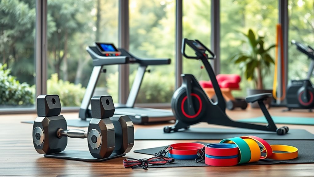 Considering your budget carefully is essential when selecting home workout equipment in 2025, as it helps you find the best value without sacrificing quality. Comparing prices across different options ensures you get effective gear at a fair cost. Budget-friendly equipment can still deliver great results, especially if it features adjustable resistance and versatile functions. Be cautious of overly cheap products, which may lack durability or safety features. Remember to contemplate long-term costs like accessories, maintenance, and potential upgrades to make a smart investment. Keep an eye out for discounts, bundle deals, and seasonal sales, which can help you secure quality equipment at reduced prices. Staying financially mindful ensures you build a reliable home gym without overspending.